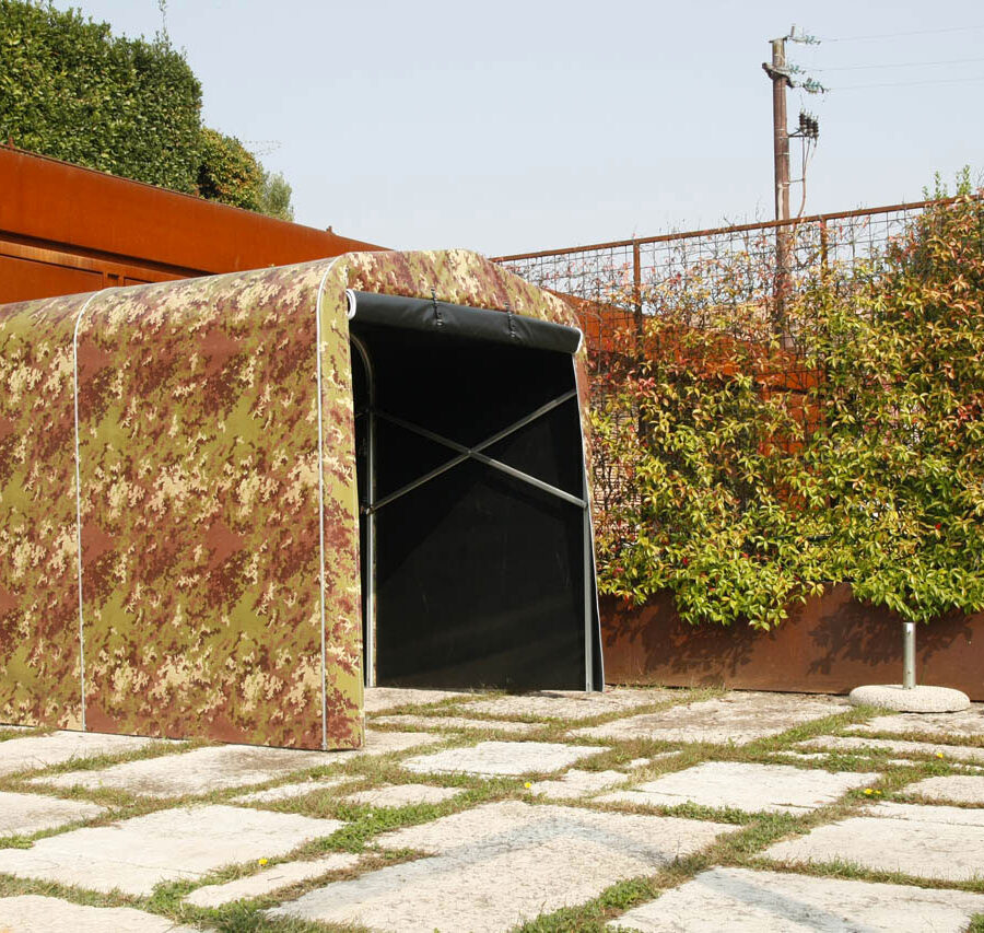 Das transparente Gittergewebe ermöglicht den Sonnenstrahlen, das Gewächshaus zu beheizen. Auf Wunsch kann das transparente Gewebe mit Tarn-PVC ersetzt werden.