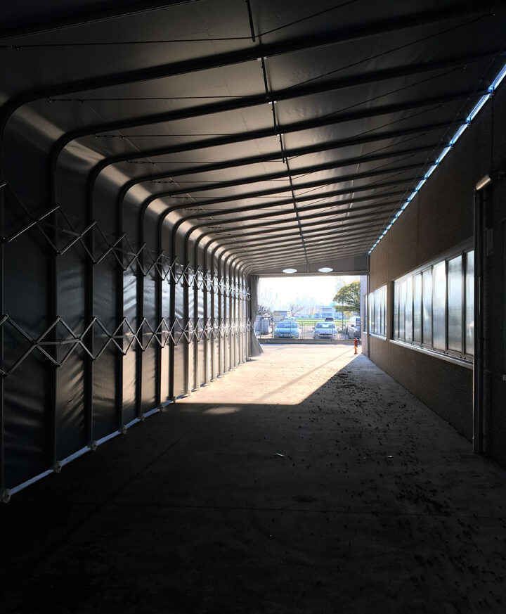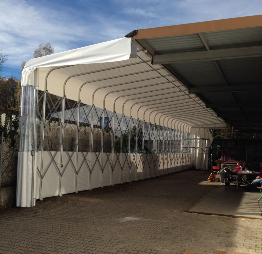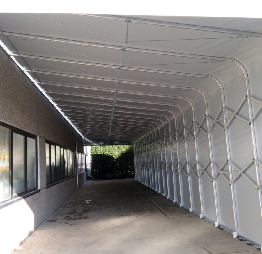 - 2 portes coulissantes en PVC avec ouverture centrale, roulettes pour rail, poignées pour ouverture rapide, profilés verticales de renforce et verrous. Les Box avec largeur inférieure à 5 m auront les portes avec ouverture à zig-zag